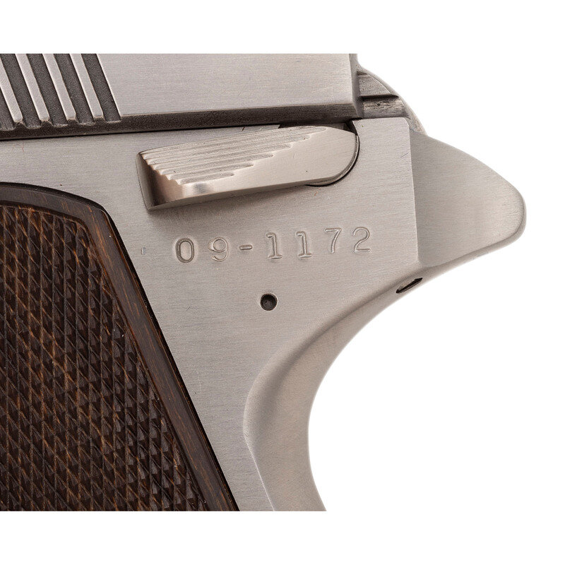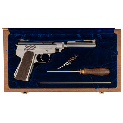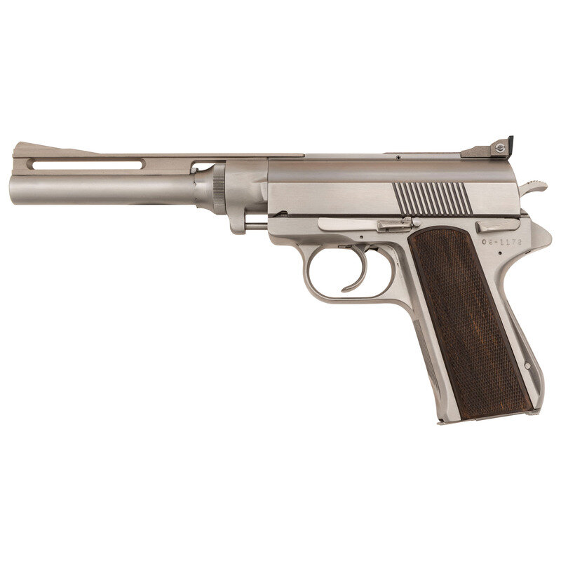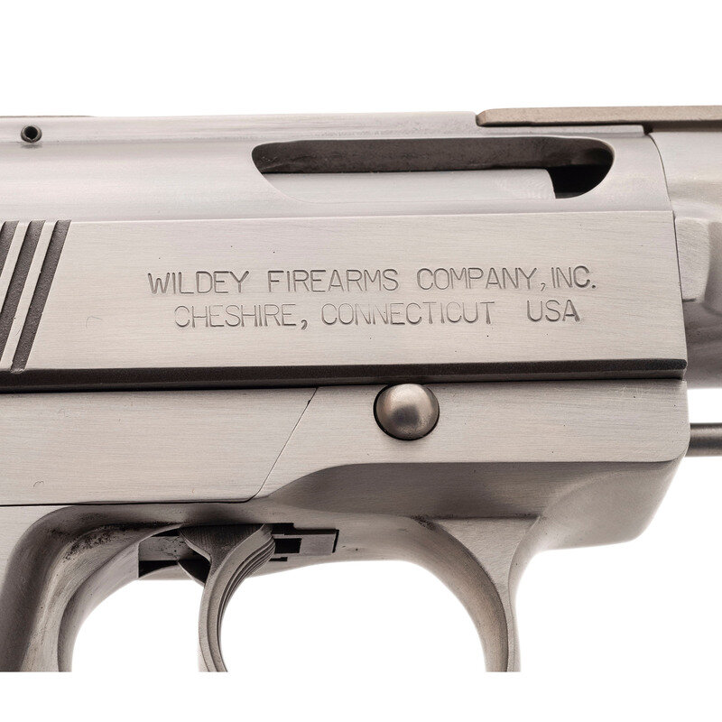 .45 Win Mag. 8" ventilated ribbed barrel. SN: 09-1172. Bright stainless steel finish, checkered wood grips. Semi-automatic rotating barrel magazine fed double action pistol with wide grooved trigger, spur hammer, adjustable black square notch rear sight and ramped front sight. Pistol is accompanied by a wooden Wildey marked fitted display and storage box that includes cleaning accessories. This early Wildey Firearms Co Inc pistol is one of the 633 produced with an "09" prefix made with the old Cheshire, CT address, built immediately after the acquisition of the old, bankrupt Wildey company. Subsequent pistols bore the New Milford, CT address. Includes a single magazine. {MODERN}