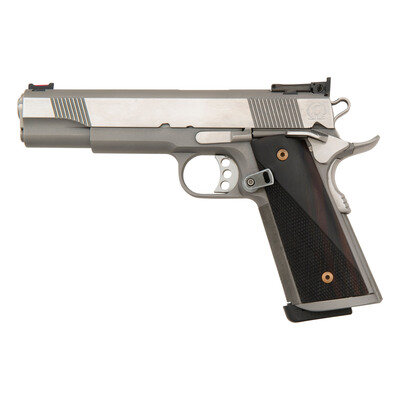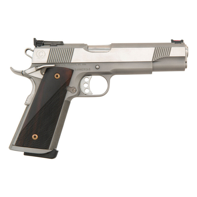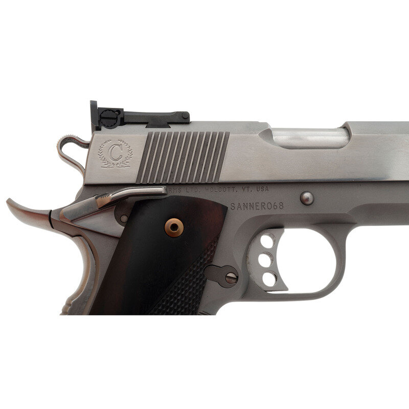 .45 ACP. 5" barrel length. SN: SANNER068. Matte stainless steel finish with polished frame flanks and small parts mounting half checkered walnut grips, adjustable matted target rear notch and red fiber optic front blade sights on a matted slide top. Short-recoil operated single action autoloading pistol fed by detachable single stack magazines featuring assorted custom features. Right frame marked in a single line CASPIAN ARMS LTD. WOLCOTT, VT. USA with both slide flanks engraved with the C within olive branches logo. Custom features include: memory groove pattern extended beavertail grip safety, checkered one piece flat mainspring housing and flared magazine well extension, checkered forward gripstrap, adjustable three hole trigger, ambidexterous and extended safety lever, skeletonized Commander hammer, front and rear cocking serrations, BRILEY barrel bushing, BRILEY barrel, full length guide rod, and a raised and extended knurled magazine release. {MODERN}