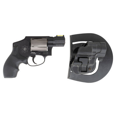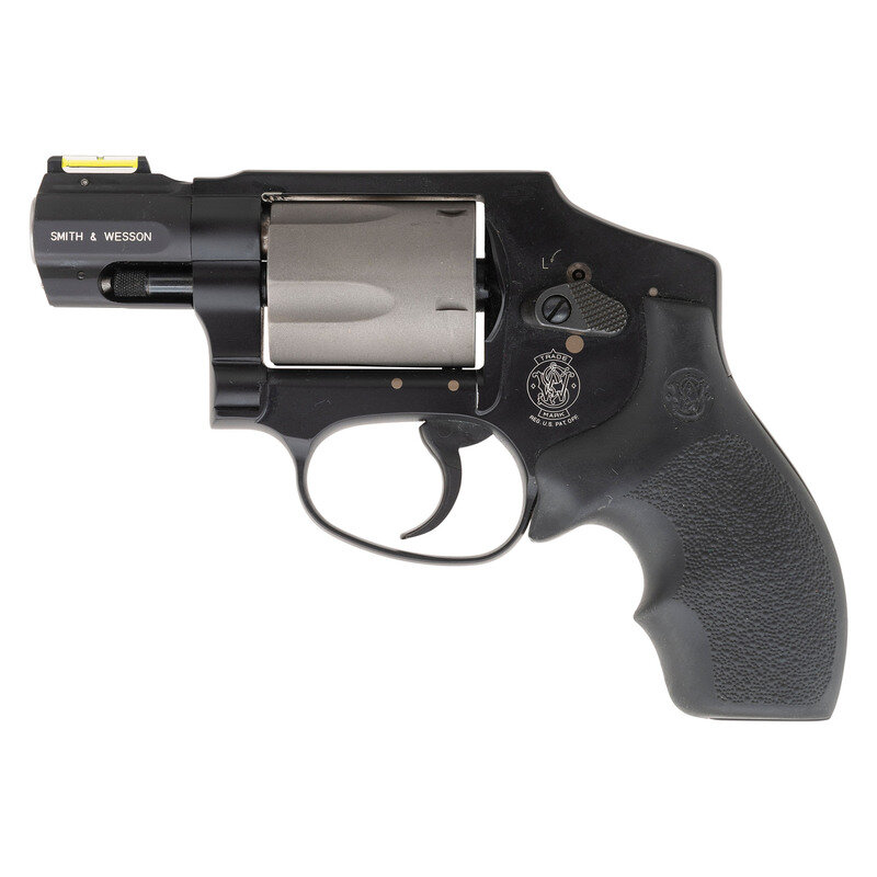.357 Magnum. 1.875" barrel length. SN: CJY2697. Black Armornite finish with gray cylinder mounting pebble texture black rubber Smith & Wesson marked grips, a fixed topstrap rear notch, and green fiber optic front sights. DAO five shot hand ejector revolver featuring a lightened Scandium frame. Standard make and model markings including two-line address to right frame, AirLitePD to the sideplate, and caliber mark to right barrel followed by NO LESS THAN 120 GR BULLET. Item comes with a black synthetic BLACKHAWK! CLOSE QUARTERS CONCEALMENT holster. {MODERN}