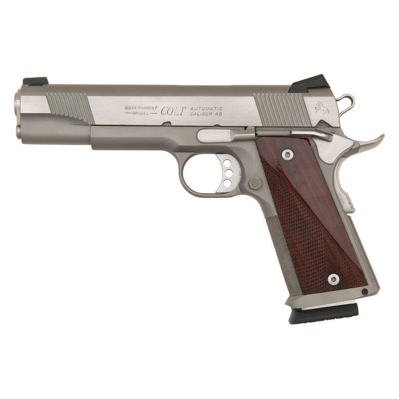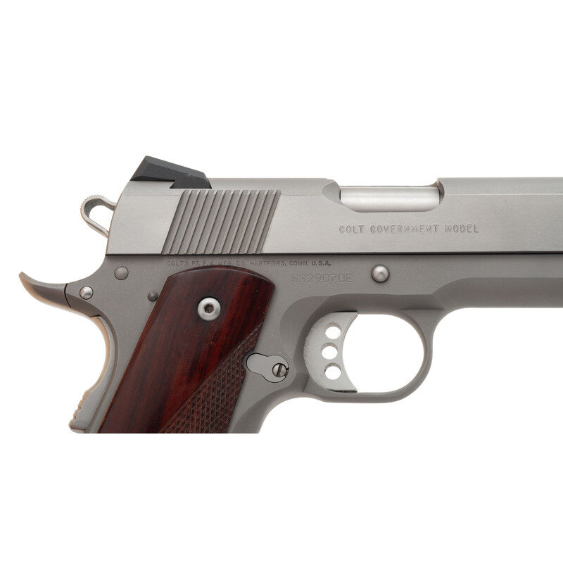 .45 ACP. 5" barrel length. SN: SS29070E. Matte stainless steel finish with polished hammer flanks mounting polished checkered wood grips and customized for competition shooting. Short recoil operated single action autoloading pistol fed by detachable single stack magazines. Standard marks include GOVERNMENT/-MODEL- COLT AUTOMATIC/CALIBER 45 to the left slide and {Rampant Colt} logo behind rear cocking serrations. Right frame struck in a single line COLT'S PT. F.A. MFG. CO. HARTFORD, CONN. U.S.A. Competition features include: High cut frame with checkered forward gripstrap, flared and extended magazine well, flat checkered mainspring housing, ED BROWN marked barrel, Ed Brown memory groove extended beavertail grip safety, NOVAK'S rear notch and Tritium front blade sights, front and rear cocking serrations, BRILEY bushing, full length guide rod, skeletonized Commander hammer, extended safety lever, extended magazine release, and an adjustable three hole trigger. Magazine features a WILSON COMBAT marked extended synthetic floorplate. {MODERN}