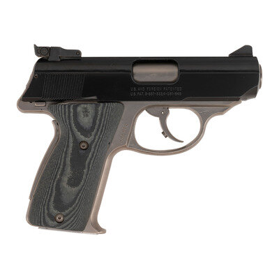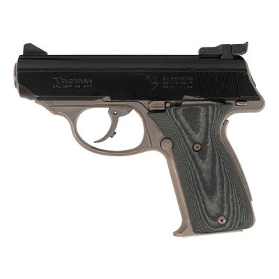 .45 ACP. 3.4" barrel. SN: 001371. Blued slide, matte stainless steel frame, smooth laminate grips. Double action only striker fired gas powered delayed blowback pistol with grip safety, adjustable white outline, square notch rear sight and serrated ramp front sight with orange insert. A truly unique pistol intended for concealed carry and back up use, only about 600 were produced circa 1977-1988. Pressing the grip safety locks the slide in place, preventing it from moving until fired and gas pressures stabilize. Reports are that these rather interesting guns had erratic performance and reliability. Includes a single magazine. {MODERN}