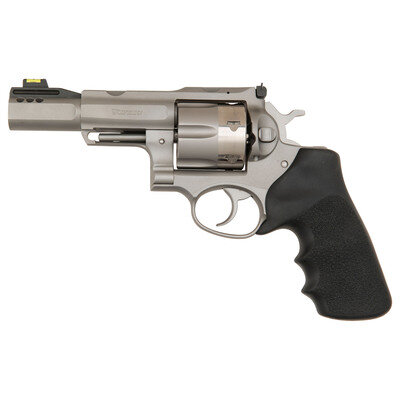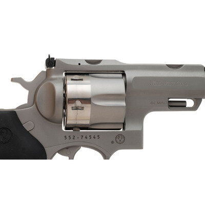 .44 Magnum. 4.5" barrel length. SN: 552-74545. Matte stainless steel finish overall with polished round to the cylinder, topstrap cut for Ruger pattern scope rings, and mounting pebble texture rubber Ruger logo grips. Double action six-shot hand ejector revolver mounting adjustable white outline target rear notch, and green fiber optic front blade sights. Barrel features triple ports to each side of the front sight base. Right frame marked WILD WEST GUNS with the left engraved WOLVERINE. {MODERN}