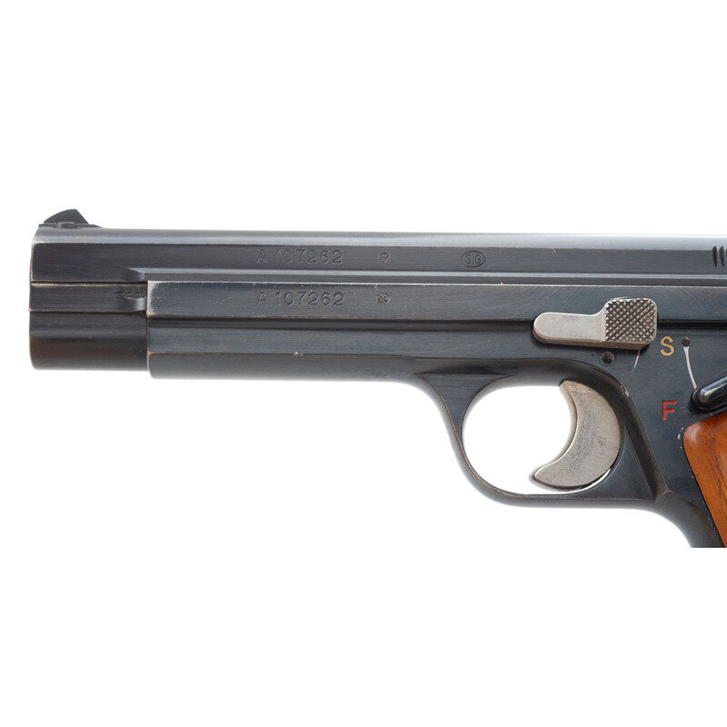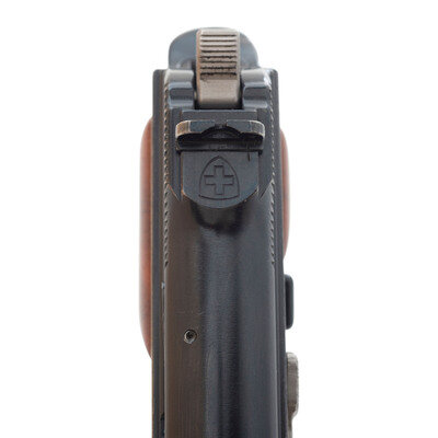 9mm Para. 4.7" barrel length. SN: A107262. High polished blued metal finish overall mounting two piece grooved wood grips, and matte small parts. Short-recoil operated single action autoloading pistol fed by detachable single stack magazines. Markings include the {Swiss Cross} to the top of the slide in front of the rear sight, combined BP pressure proofing to the left slide and right barrel, the K+ Waffenfabrik Bern inspection marking to the left frame, and circled SIG manufacturer marking on the left slide. Serial numbers match on the frame, slide, and barrel. Faint pen markings to the interior of the left grip panel. Serial number is consistent with the early third military contract, indicating this pistol was manufactured between 1950 and 1951. Item features the safety notch for the hammer, checkered slide stop, and smooth safety lever. The A prefix to the serial number indicates this handgun was produced for military contract. Base of magazine well struck with importer markings from CKC PORIS, OH that inaccurately state its caliber to be 7.62mm. Comes with a correct P49 leather shoulder holster featuring the boxed {Swiss Cross/Wy} stamp above maker marking H. WITTWER/WORB/72. Comes with one spare magazine, and a leather drawstring pouch of spare parts including: firing pin, heel release, two firing pin springs, firing pin stop plate. Pouch mounts a riveted plate reading Pist. 49. {C&R}