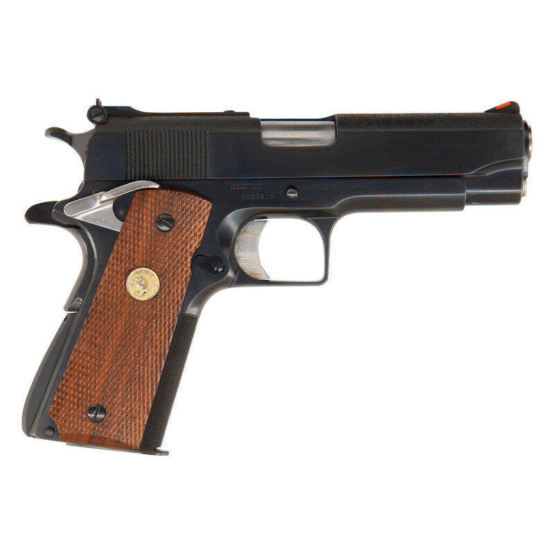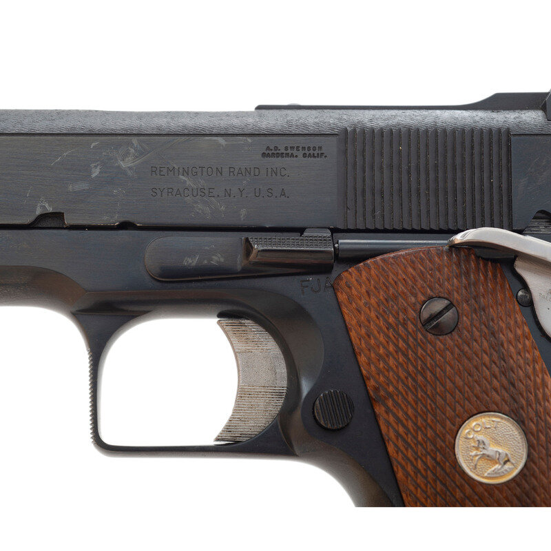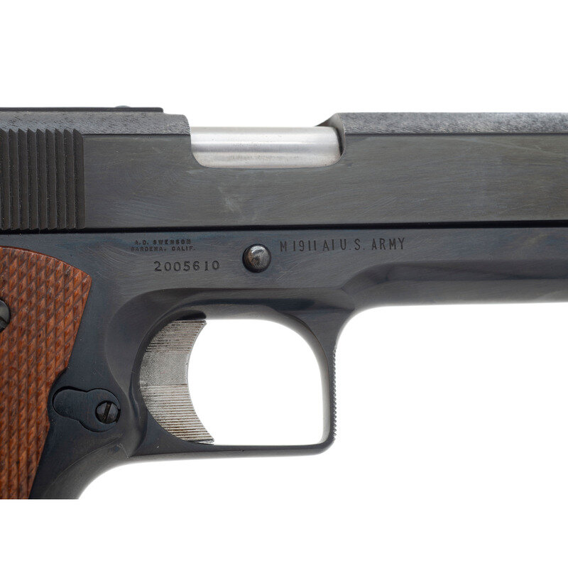 .45 ACP. 4.25" barrel length. SN: 2005610. Blued metal refinish with polished barrel mounting checkered walnut Colt medallion grips. Short-recoil operated single action autoloading pistol fed by detachable single stack magazines that has been customized and rebuilt by Armand Swenson. The slide and frame are struck with the two-line A.D. SWENSON/GARDENA, CALIF., while the flanks of the ambidexterous safety are marked A.D. SWENSON/FALL BROOK, CALIF. Original manufacturer markings include REMINGTON RAND INC./SYRACUSE, N.Y. U.S.A. on left slide, FJA initials for inspector Frank J. Atwood on left frame, and M 1911 A1 U.S. ARMY to the right frame. Item converted to Commander size and features numerous modifications consistent with Swenson's work including: ambidexterous and extended safety lever, bordered matting on the upper slide, matted rear slide, checkering to forward gripstrap, Smith & Wesson K-38 rear notch and front ramp sights, squared off and checkered triggerguard, vertically serrated adjustable trigger, beveled magazine well, and full length guide rod. {MODERN}