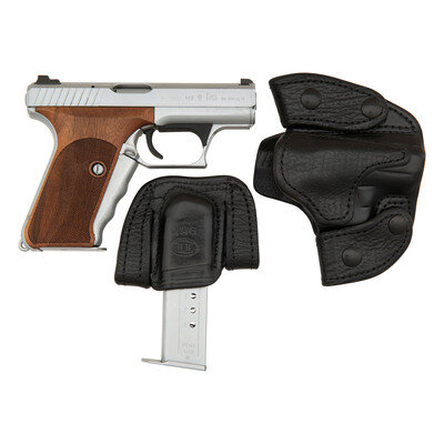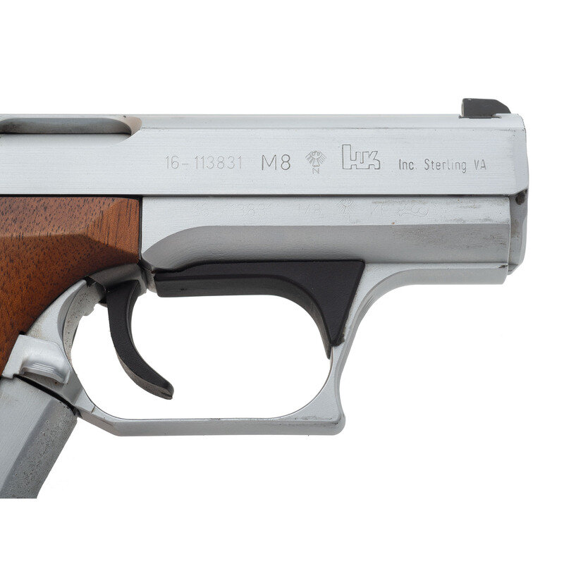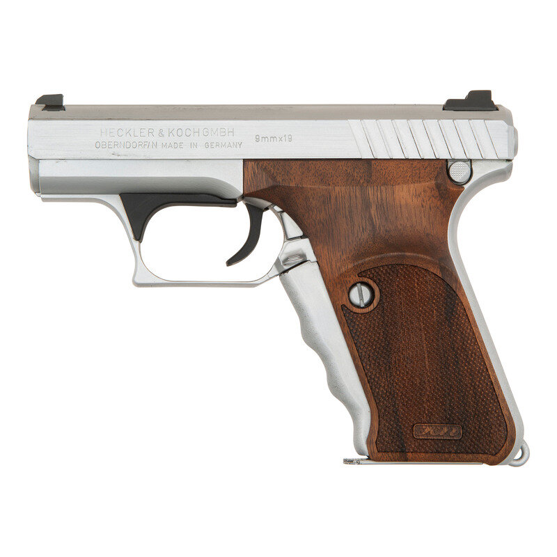 9mm Para. 4.1" barrel length. SN: 16-113831. Nickel plated finish with blued trigger mounting checkered walnut Kn initial Karl Nill grips and fixed triple white dot sights. Gas delayed blowback operated autoloading pistol fed by detachable single stack magazines and featuring the P7's distinctive squeeze cocking mechanism. Item features ambidexterous lever type magazine release behind trigger. Markings include the two-line legend on left slide reading HECKLER & KOCH GMBH/OBERNDORF/N MADE IN GERMANY 9mmx19. Right slide shows M8 marking, German firing proof, and HK Inc. Sterling VA importer mark. Item comes with a total of two nickel plated magazines, an outside waistband leather holster, and TT/GUNLEATHER marked single cell spare magazine holder. {MODERN}