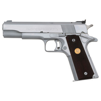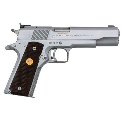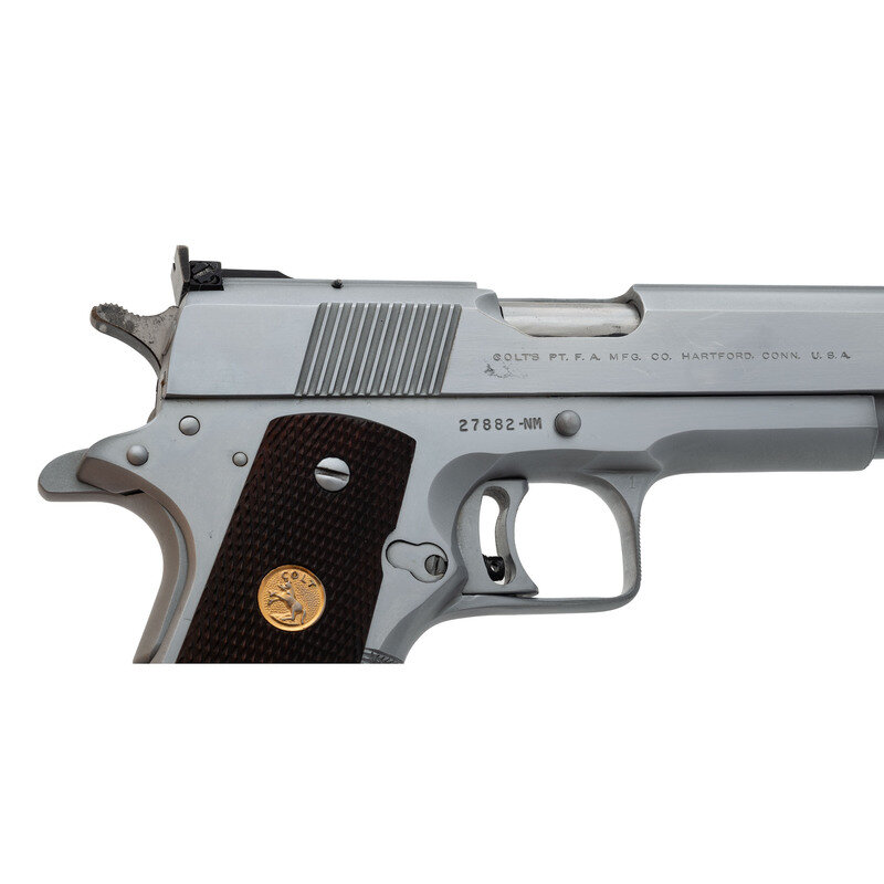 .45 ACP. 5" barrel length. SN: 27882-NM. Matte stainless steel finish with polished flats mounting checkered walnut Colt medallion grips. Short-recoil operated single action autoloading pistol fed by detachable single stack magazines. Standard markings include NATIONAL/MATCH COLT AUTOMATIC/CALIBER .45 followed by {Rampant Colt} logo on left slide. Single line address to right slide reads COLT'S PT. F.A. MFG. CO. HARTFORD, CONN. U.S.A. Item features a checkered forward gripstrap, a beveled magazine well, adjustable ELLIASON rear notch and front blade sights, a flat mainspring housing, adjustable wide trigger, and squared and checkered triggerguard. {MODERN}