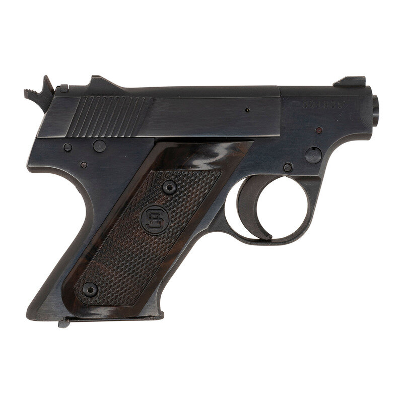 .380 ACP. 1.5" barrel. SN: 001835. Blued finish, checkered mottled brown plastic SA logo grips. Single action, blowback semi-automatic pistol with removable magazine, fixed notch rear sight, serrated ramp front sight, cross bolt safety, short spur external hammer and heel magazine release. These unconventional looking semi-automatic pistols have the appearance of a "chopped and channeled" High Standard pistol crossed with a Sci-Fi ray gun. The pistols were not particularly successful and were only made in relatively small quantities circa 1970-1972. These strange little pistols are rarely seen on the market for sale. Includes a single magazine. {C&R}