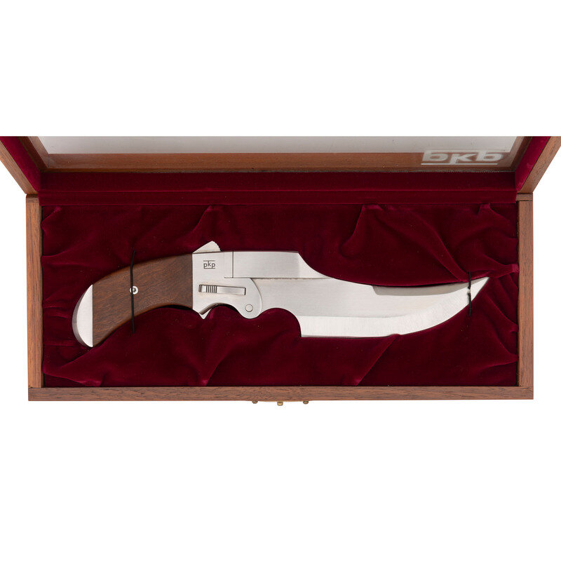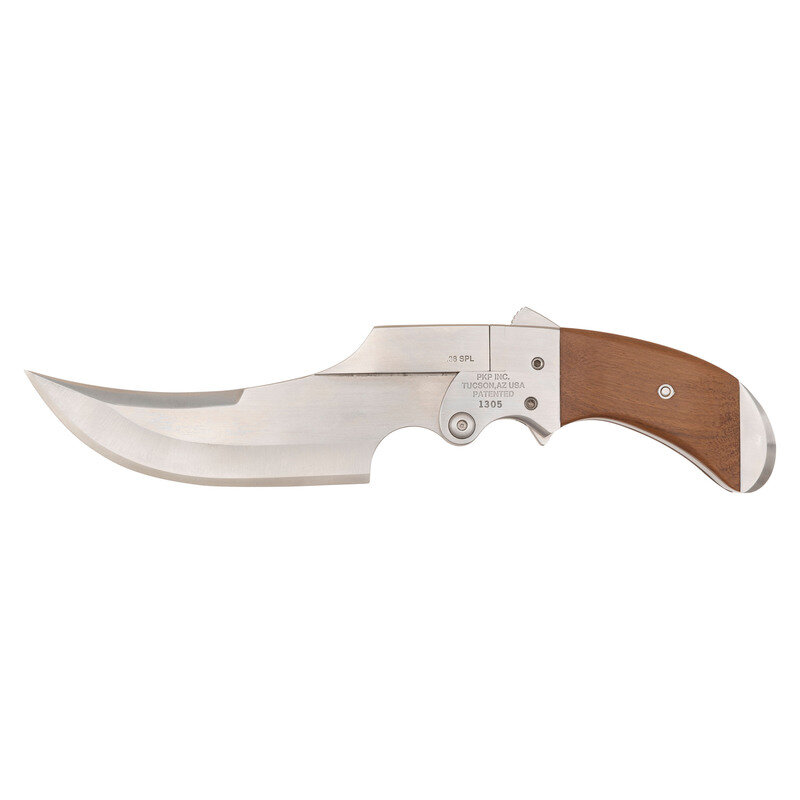 .38 Special. 1.75" barrel. SN: 1305. Bright stainless finish, smooth hardwood grip scales. Single action spur trigger tip down single shot combination knife pistol with no sights and a 6.25" single edged clip point Bowie style blade. In glass topped wood display case. A rare and interesting take on the Elgin Knife Pistol of the 1840s, combining a fixed blade fighting knife with a single shot pistol. {MODERN}