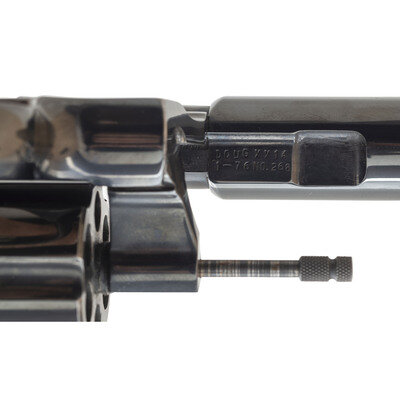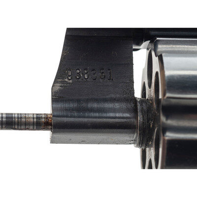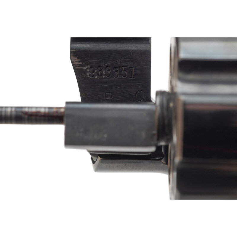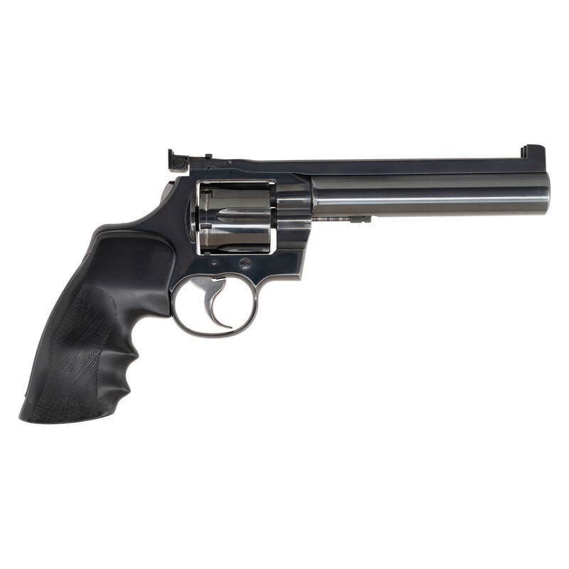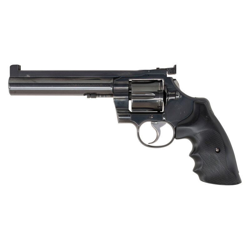 .38 Special. 6" bull barrel. SN: 938351. Blued finish, checkered rubber finger groove grips. Double action revolver with fluted, 6-chambered swing out cylinder, customized for competition by Power Custom of Independence, MO. Appears to have been built on a Colt Police Positive Special Third Issue revolver with a Power Custom bull barrel, a Bo-Mar heavy barrel rib with adjustable rear and winged blade front sights, a bobbed hammer, polished trigger and a tuned action. {MODERN}