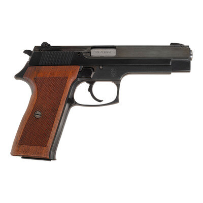9mm. 4.75" barrel. SN: 301672. Blued finish, checkered hardwood grips. Conventional double action semi-automatic pistol with removable magazine, elevation adjustable rear and dovetailed front blade three dot sights, manual thumb safety to allow Condition 1 carry, left hand magazine release and fixed lanyard loop. Pistol includes a single 15-round magazine. {MODERN}