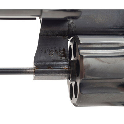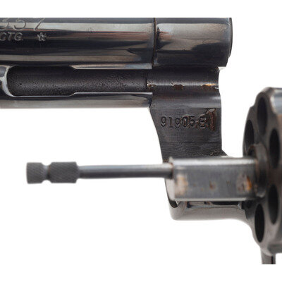 .357 Magnum. 6" ventilated rib barrel. SN: 91905E (mfg. ca. 1978). Blued finish, checkered finger groove Hogue Monogrip wood grips. Double action revolver with six-chamber fluted swing out cylinder, matted barrel rib, adjustable Eliason rear sight and pinned semi-partridge front sight blade. {MODERN}