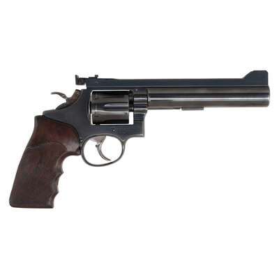 .38 Special. 6" bull barrel with oversized grooved top rib. SN: 1K42871. Blued finish, checkered hardwood finger groove grips. Double action custom target revolver six-chambered fluted swing out cylinder. Customized by Ron Power of Independence, MO and marked XX14 over 4-76 over No. 304 on the flat under the barrel, concealed by the ejector rod. Custom features include the bull barrel with heavy, large Bo-Mar top rib that incorporates a fully adjustable rear sight and a winged blade front sight. A polished smooth trigger with over travel adjustment screw and the Hogue style palm swell, checkered finger groove grips. This would likely be a wonderful Bullseye revolver. {MODERN}