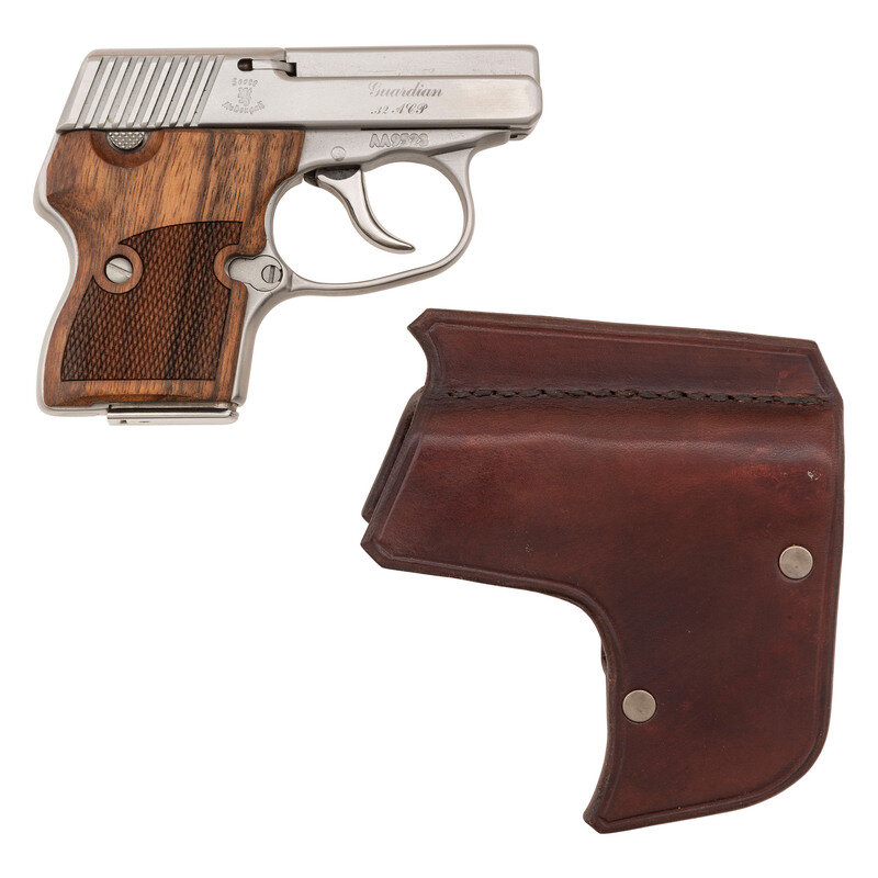 .32 ACP. 2.1" barrel. SN: AA9523. Matte stainless finish, checkered wood grips. Double action only delayed blowback semi-automatic pistol customized by Scott, McDougall & Associates. Features include a melt job for discrete carry, removing all sharp edges, no sights, action and reliability package and an RJ Hedley pocket holster. Includes a single magazine. {MODERN}