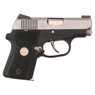.380 ACP. 2.75" barrel. SN: NR08587. Bright slide, blackened aluminum frame, checkered Rampant Colt medallion plastic grips. Double action only short recoil tilting barrel semi-automatic pistol with removable magazine, customized by Scott, McDougall & Associates. Features include Novak-style low mount combat sights, checkered front strap, action tuning and trigger job, complete "melt job" to dehorn the sharp edges and custom refinishing of the frame. Includes a single magazine. {MODERN}