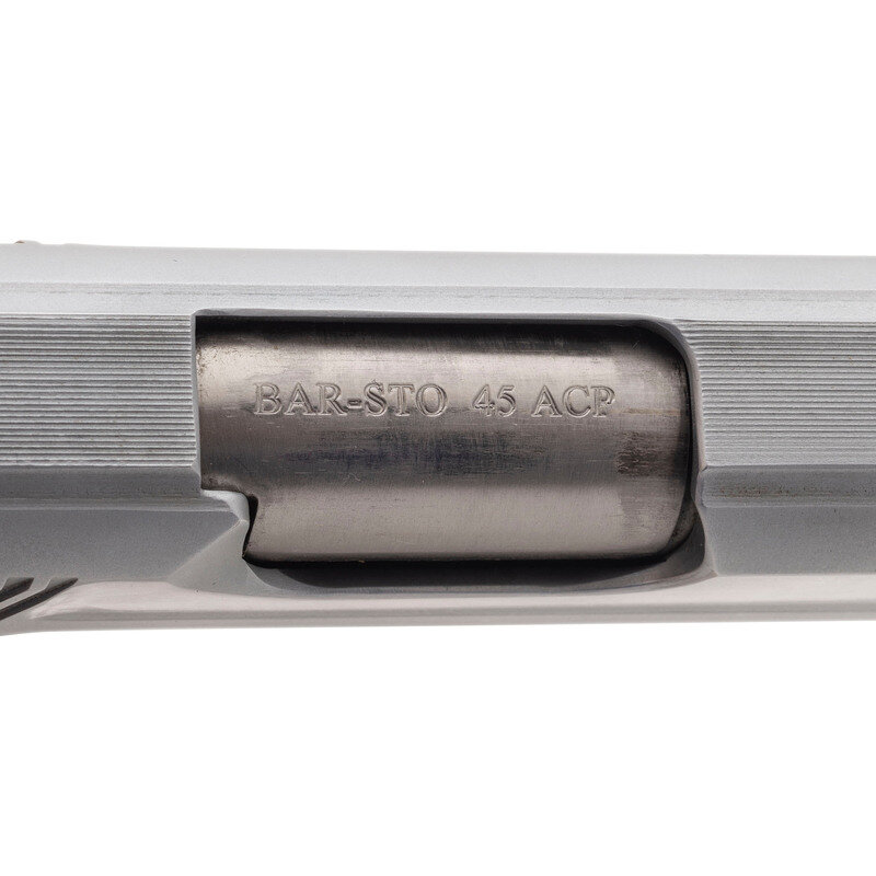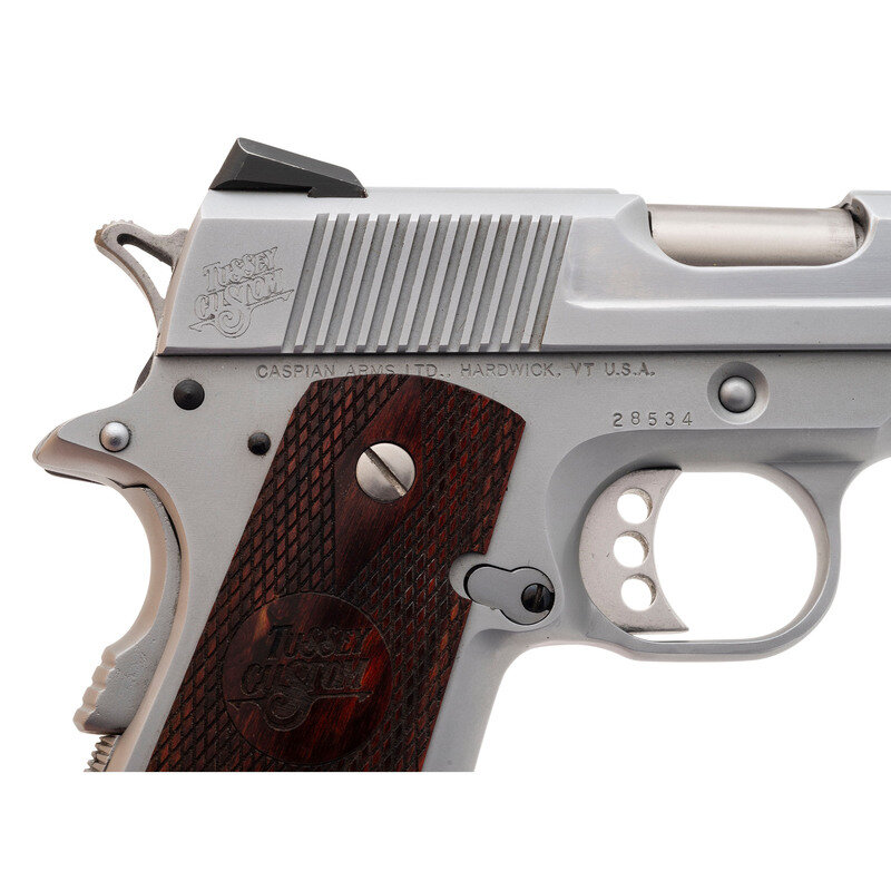 .45 ACP. 3" barrel. SN: 28534. Matte stainless frame, matte and polished stainless slide, checkered Tussey logo double-diamond wood grips. Single action semi-automatic Browning tilting-barrel custom compact 1911 pattern pistol. Built on a Caspian frame with a Caspian slide, with the Tussey Custom logo at the right rear of the slide. Features include a 3" bull nose, bushingless Bar-Sto barrel, full-length guide rod, "memory groove" Ed-Brown type grip safety, skeletonized semi-Commander style hammer, skeletonized trigger with over-travel adjustment, melted, contoured and grooved thumb-safety and magazine release, checkered flat mainspring housing and Novak style low-mount three-dot combat sights. Includes a single 6-round magazine. A wonderful concealment sub-compact 1911 pistol by one of the best 1911 pistolsmiths. Tussey started gunsmithing circa 1959 and ran his own shop in the Reno area from about 1979 until his passing in 2020. He specialized in building high-end custom pistols and doing modifications on factory guns and counted many top shooters, gun writers and actors among his clientele. {MODERN}