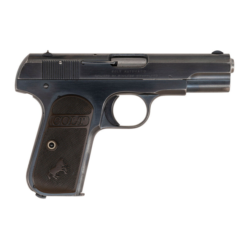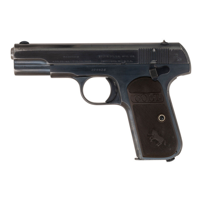 .32 ACP. 3.75" barrel. SN: 218916 (mfg. ca. 1916). Blued finish, checkered hard rubber Rampant Colt logo grips. Single action blow back operated semi-automatic pistol with removable magazine, thumb safety, fixed dovetailed notch rear sight and blade front sight and heel magazine release. Includes a single two-tone CAL .32/COLT marked magazine. {C&R}