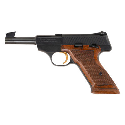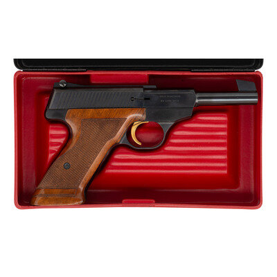 .22LR. 4.5" barrel. SN: 5402U2 (mfg. ca. 1962). Blued finish, gold trigger, checkered wood grips. Single action semi-automatic blow back operated pistol with removable magazine, thumb safety, adjustable rear sight and semi-Patridge front sight blade. The gun is accompanied by its original black and red plastic Browning box and manual. This pistol was previously sold by James Julia as part of the The Frank H. Wheaton, III Collection and retains those tags. {C&R}