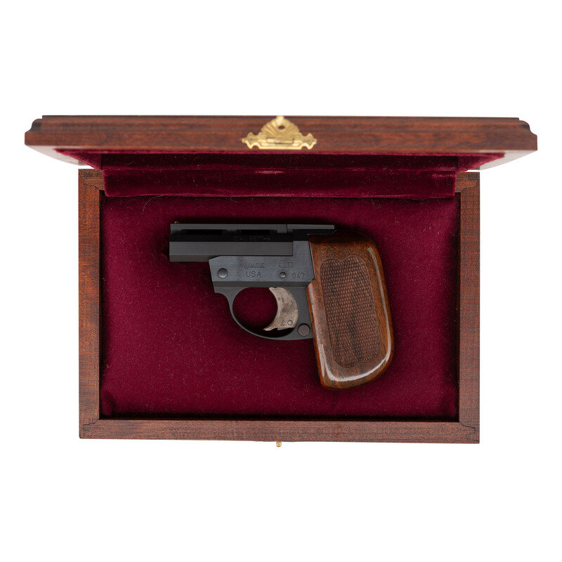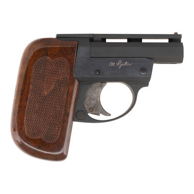 .22 Mag. 2.6875" barrel length. SN: 047. Matte blued metal finish with high polish blued frame flanks mounting one piece checkered walnut grips and case colored trigger. Double barrel side by side break action Derringer pistol with manually actuated extractors. Item features a brass bead sight on a vented barrel rib. Left frame struck with the maker marking Ljutic/USA followed by model Lj II. Right frame is engraved with the signature of Al Ljutic over PAT. PEND. Comes in a walnut presentation case with maroon velvet lined interior. Item comes with the original receipt dated November 18, 1991. {MODERN}