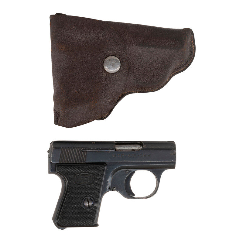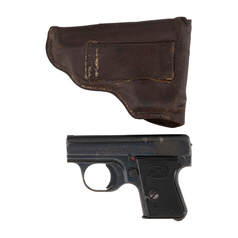 6.35mm (.25 ACP), 2" barrel. SN: 57691. Blued finish, checkered plastic Mauser banner grips. Single action blow back operated semi-automatic pocket pistol with removable magazine, frame mounted safety, heel magazine release and groove in top of slide for sights. Includes a small leather flap holster with snap closure. {C&R}