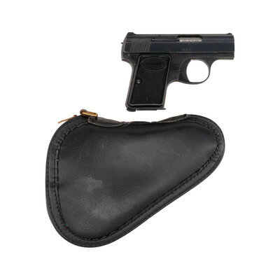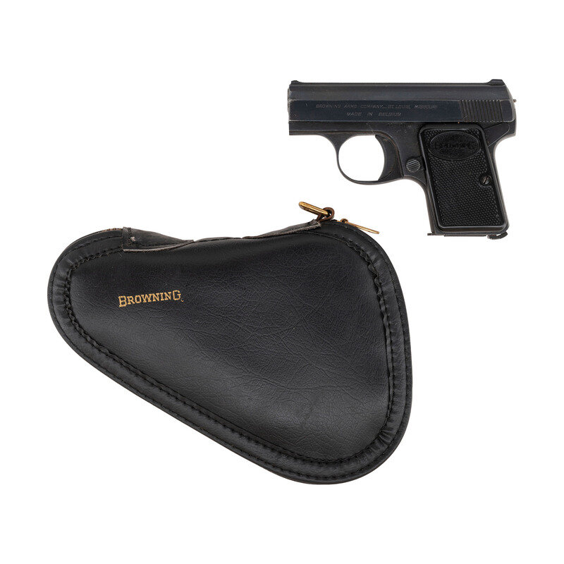 6.35mm (.25 ACP). 2" barrel. SN: 118510 (mfg. ca. 1954-1958). Blued finish, bright barrel, Browning logo checkered plastic grips. Single action direct blow back semi-automatic pistol with removable magazine, frame mounted safety and rudimentary fixed sights. Left side of slide marked BROWNING ARMS COMPANY_ST. LOUIS, MISSOURI/ MADE IN BELGIUM. Marked with Belgian proofs throughout. Includes a single magazine. {C&R}