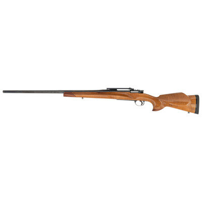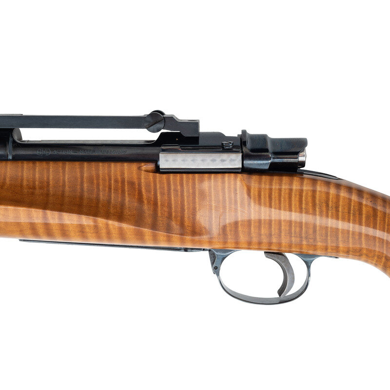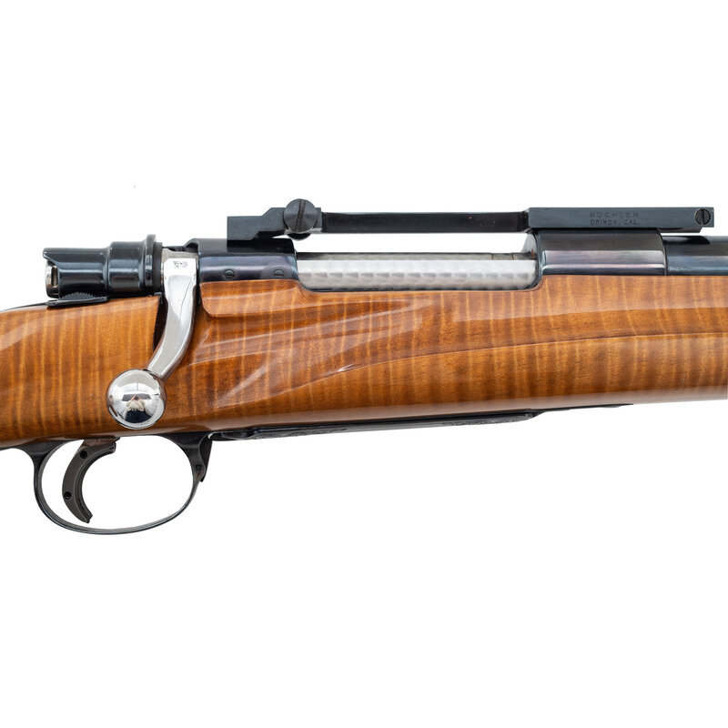 7x61 S&H. 27" round barrel. SN: NSN. Blued finish, highly figured smooth pistol-gripped hardwood stock with contrasting wood at the forend tip and grip cap and rubber recoil pad. Bolt action fixed magazine custom hunting rifle with Buehler scope mounting and QD sling swivel mounts. A really well made custom rifle in formerly popular European cartridge that was overshadowed in the US by the 7mm Remington Magnum. {MODERN}