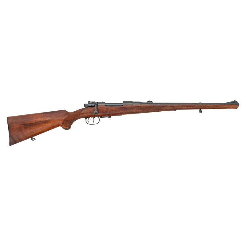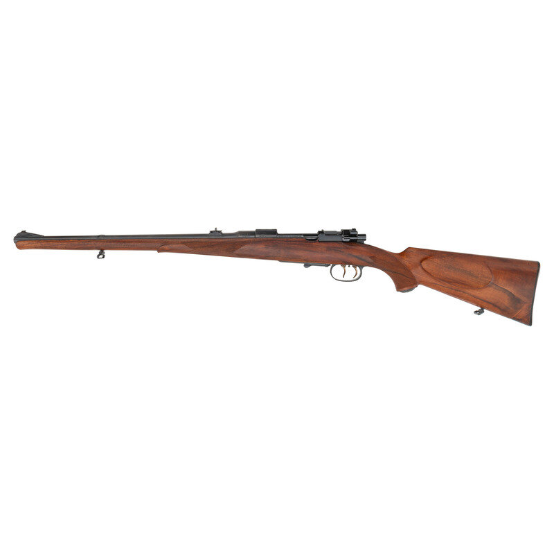 7x57. 22.5" barrel. SN: 123066. Blued finish, hardwood Mannlicher Schoenauer stock. Bolt action fixed magazine fed sporting rifle with three-leaf rear sight, ramped front sight blade with brass bead, double set triggers, matted chamber and sling swivels. {MODERN}