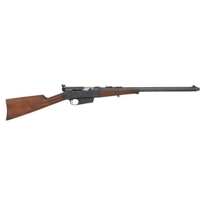 .35 Remington. 22.75" barrel length. SN: 65477. Blued metal finish with polished bolt set in walnut straight wrist stock with Schnabel forend. Long-recoil operated semi-atuomatic rifle charged with an internal box magazine. Sights consist of a MARBLE NO. 2 front blade and MARBLES adjustable semi-buckhorn rear sight. A REDFIELD aperture sight is fitted to the rear receiver. Manufacturer markings include Remington/TRADE MARK/MODEL 8 to left receiver and two-line barrel address and patent mark reading THE REMINGTON ARMS UNION METALLIC CARTRIDGE CO. INC., REMINGTON ILION WORKS, ILION, N.Y. U.S.A./BROWNING'S PATENTS. OCT. 9. 1900. OCT. 16. 1900. JUNE 3. 1902. MAY 14. 1907. AND FEB. 14. 1911. {C&R}