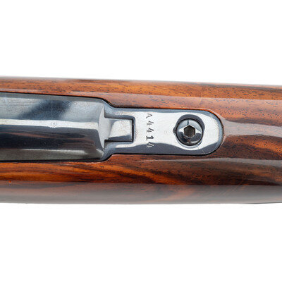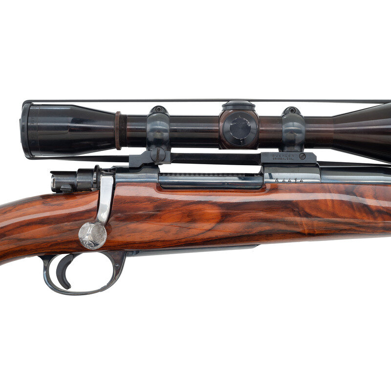 6mm Ackley Improved. 26" barrel. SN: A4414. Blued finish, jeweled bolt, highly figured Monte Carlo style stock with Pachmayr recoil pad. Bolt action fixed magazine custom rifle mounted with a Leupold 8x scope in Buehler mounts, with QD swivel studs. {MODERN}