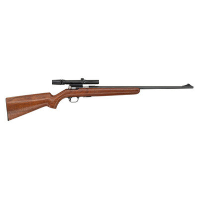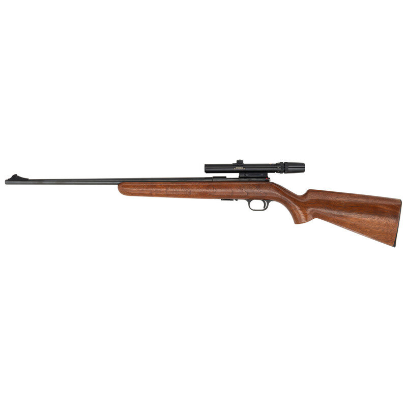 .22LR. 22" barrel. SN: 8990X6. Blued finish, smooth walnut stock. Removable magazine fed straight pull bolt action rimfire rifle mounted with a Bushnell 3-7x scope. Includes a single magazine. {C&R}