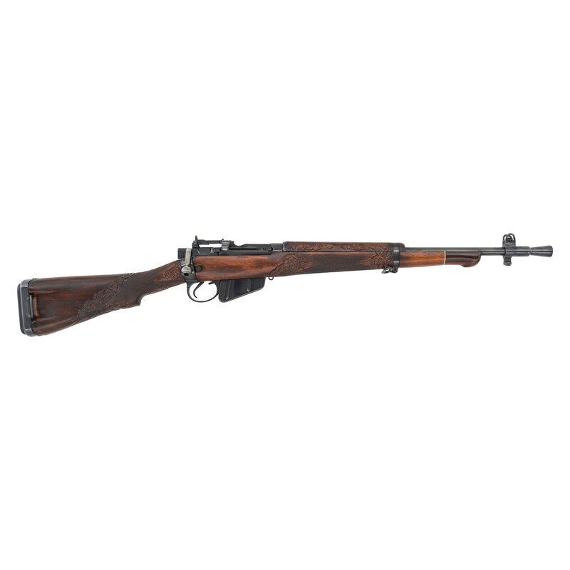 .303 British. 18.75" barrel length. SN: 762920. Custom polished blued metal finish with polished bolt handle, jeweled bolt body, and set in elaborately carved walnut semi-pistol grip stock with rosewood Schnabel forend and mounting the original rubber recoil pad buttplate. Bolt action repeating rifle fed by a semi-detachable magazine. Item mounts the correct rear sight graduated to 800 yards with intact battle aperture. Flash eliminator is pinned in place and retains faint M47C manufacturer code. Maker marks and original model marks have been eliminated in the refinish but British {Broad Arrow} marks visible on major parts. Serial number remains visible on left receiver. Forend and wrist are hand checkered with triple bordered multipoint checkering enveloped by floral scrollwork. {MODERN}