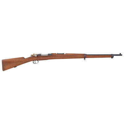 7x57mm. 29" barrel length. SN: H6772. Blued metal finish with polished bolt and nitre blued small parts in walnut straight wrist stock with half length upper handguard. Bolt action internal magazine fed repeating rifle charged with stripper clips mounting standard adjustable tangent rear notch and front blade sights. Left receiver markings read MAUSER CHILENO MODELO 1895/MANUFACTURA LOEWE BERLIN. with the {Chilean Seal} on top of the receiver. Item shows the Chilean {Crossed Picks} marking to major parts. Left butt stamped with {Chilean Seal/1895}. Serial numbers match where visible. Item lacks cleaning rod. {ANTIQUE}