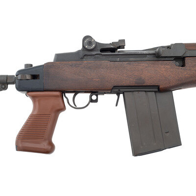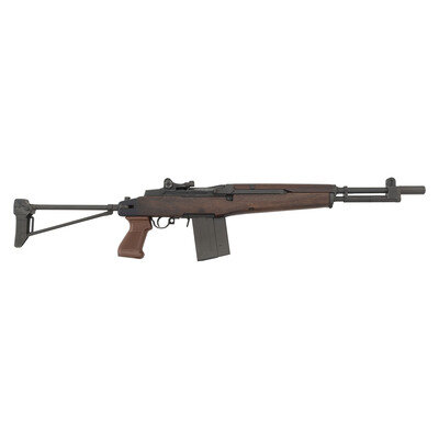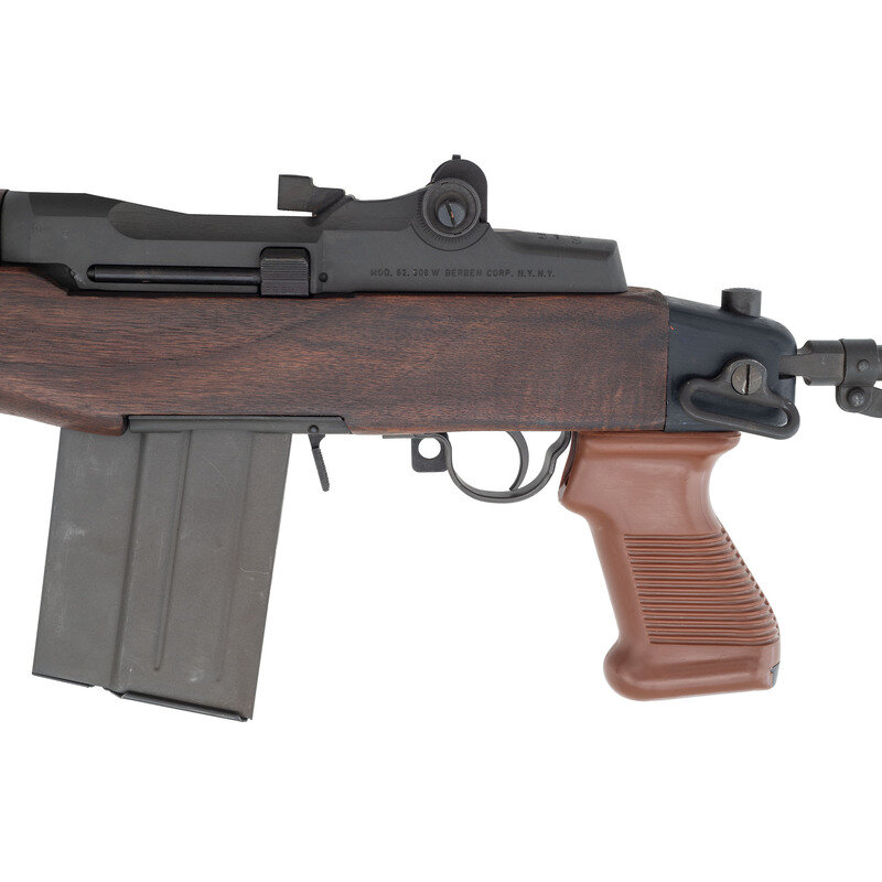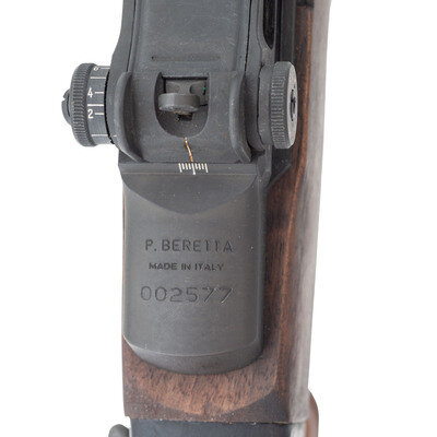 .308. 19" barrel length. SN: 002577. Parkerized metal finish with brown Bakelite pistol grip, walnut forend and upper handguard, and sidefolding steel buttstock. Long stroke piston driven gas operated rifle using a rotating bolt lockup and fed by detachable box magazines. Manufacturer marks to rear receiver read P. BERETTA/MADE IN ITALY. Left receiver struck MOD. 62. 308 W BERBEN CORP. N.Y. N.Y. Item features standard Italian firing proofs to the right barrel and BM59 marking to the operating rod. Imported by Bergen Corp in the 1980s, the BM62 was manufactured by Beretta for the civilian market as a semi-automatic only version of the BM59. These were made available in multiple configurations, including with the folding stock seen on Alpine and Paratrooper versions of the BM59. Less than 2,000 BM62 rifles were imported into the United States, making them far more scarce than semi-automatic converted BM59 rifles. {MODERN}