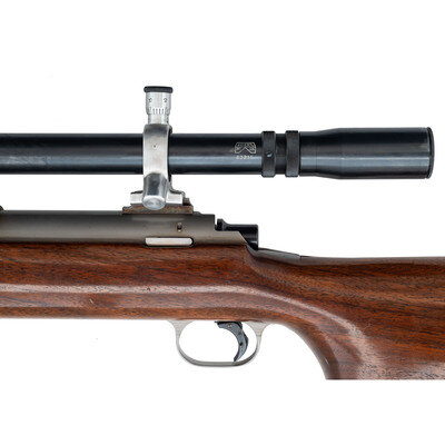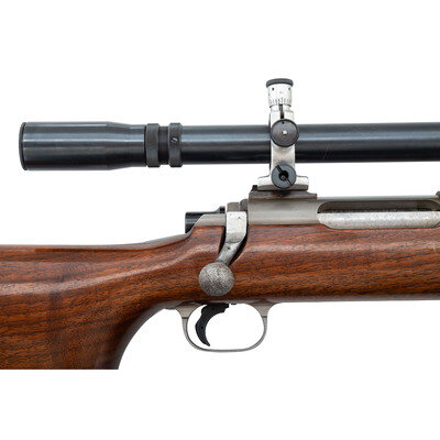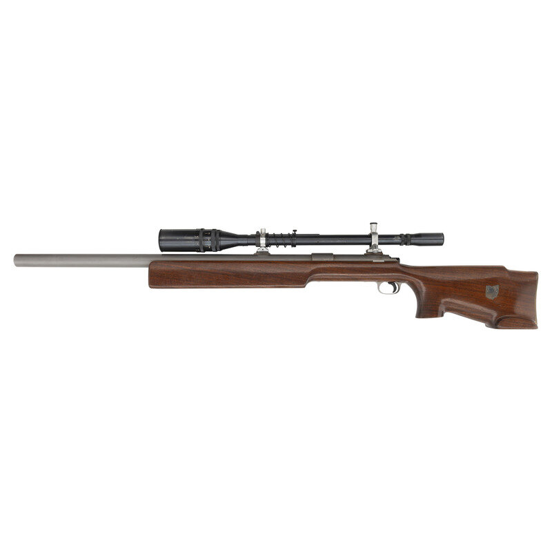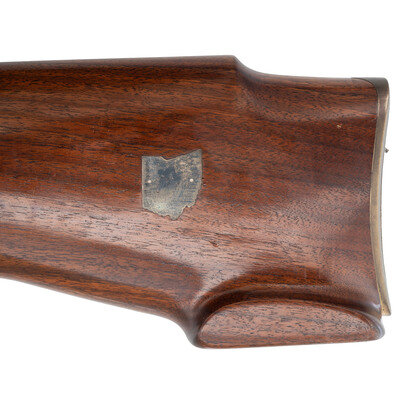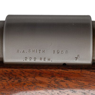 .222 Remington. 30" heavy barrel. SN: 75. Matte stainless finish, "jeweled" bolt with stippled knob, stippled brass John Oberlies marked buttplate, heavy bench rest hard wood stock. Bolt action single shot bench rifle with an 1958 dated RA Smith barrel, John Oberlies custom work including the bolt, buttplate and possibly the stock, shoed competition trigger, mounted with a J. Unertl 20x scope in Unertl adjustable mounts with screw off covers. Reverse of butt with state of Ohio inlay. The rifle weighs slightly more than 23 pounds. Due to excessive weight, extra shipping costs will apply. {MODERN}