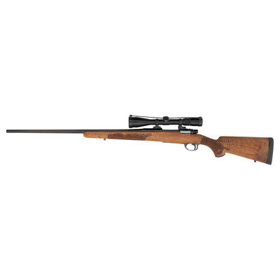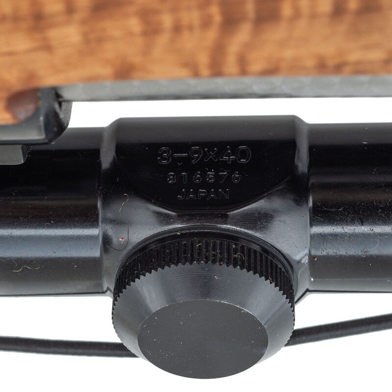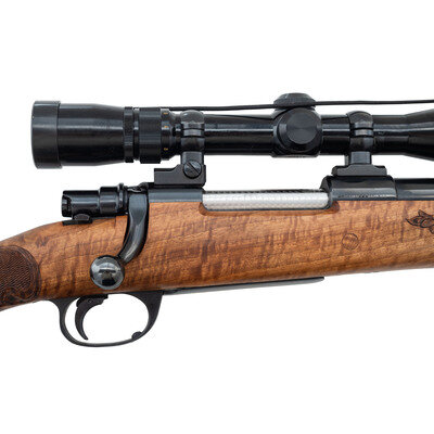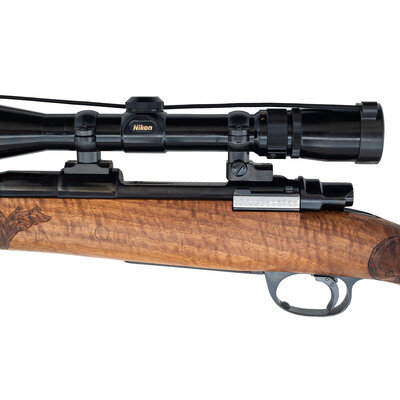 .30-06 Ackley Improved. 27" barrel. SN: NSN. Blued finish, jeweled bolt, checkered pistol-gripped figured wood stock with raised cheek rest and checkered forend. Custom bolt action fixed magazine Mauser action rifle mounted with a Nikon 3-9x40 scope. Stamped WH Houbaugh in script on the left side of the barrel in front of the chamber, marked SAINT HUBERT on the right side of the chamber, CZ marked action. {MODERN}