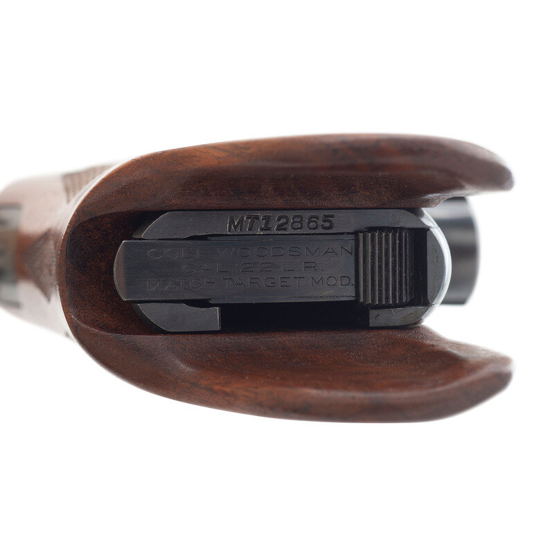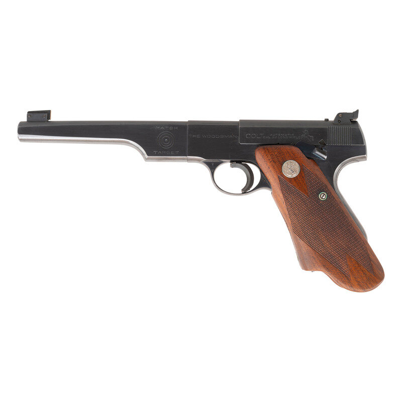 .22LR. 6" barrel. SN: MT12865 (mfg. ca. 1941). Blued finish, checkered Rampant Colt medallion "Elephant Ear" wood grips. Single action fixed barrel semi-automatic target pistol with adjustable target rear sight and pinned blade front sight with gold painted rear face. Includes a single magazine marked Colt Woodsman/CAL. 22LR/Match Target Model marked magazine. Pistol is in the original box with a pair of custom grips, a set of Colt grip adapters, two sets of grip screws, a cleaning rod and paperwork. {C&R}