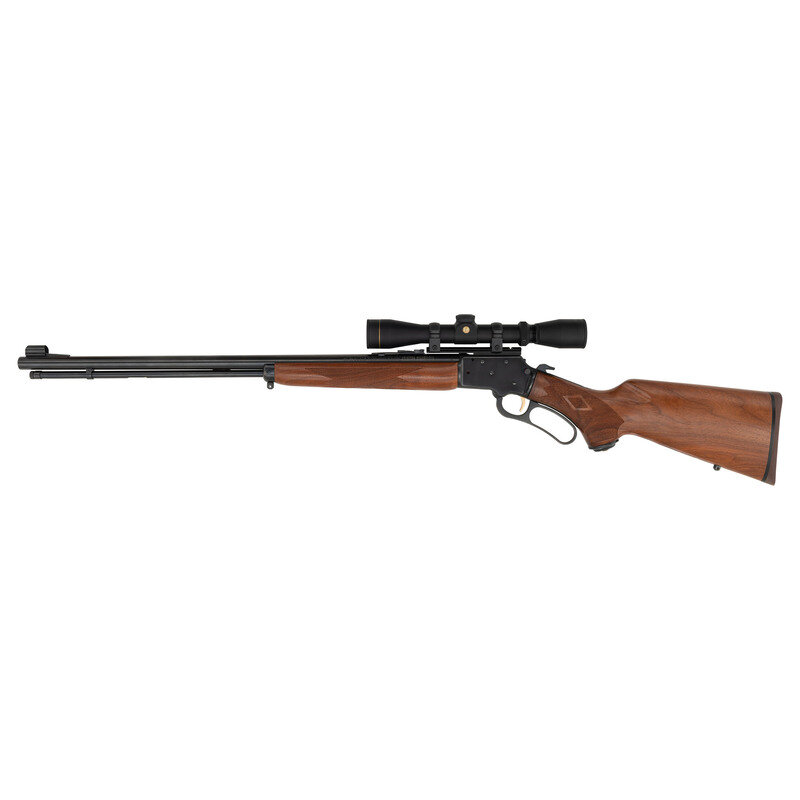 .22 S, L, LR. 24" barrel length. SN: 97302802. Blued metal finish with matte blued flats mounting walnut semi-pistol grip stock with multipoint checkering to wrist and forend, gold trigger, takedown frame, and recoil pad to butt. Lever action repeating rifle fed by a frontally charged tube magazine. Item mounts fully hooded front bead and folding rear notch sights in addition to Weaver rail mounted Leupold VX-1 scope. Standard make and model markings including WARNING mark to right barrel. Left barrel struck ORIGINAL GOLDEN-39A. {MODERN}