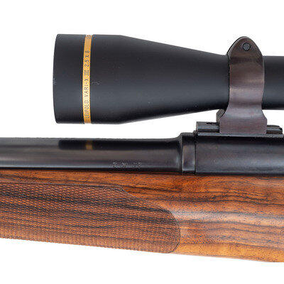 7x57mm. 19" barrel length. SN: T.69. Blued metal finish with polished bolt body set in high grade walnut semi-pistol grip stock with Mannlicher style forend and hand checkered wrist and forend. Bolt action internal magazine fed repeating rifle mounting a LEUPOLD VARI-X III 2.5X8 telescopic sight. Item further mounts a folding two-position rear notch and front blade sights. Widow's peak buttplate is checkered, and the rifle mounts a deep relief engraved semi pistol grip cap with {Wild Turkey} design. Flat paddle bolt handle. Manufacturer mark to the top of the barrel reads W.S. CALFEE - BORDEN, IND.