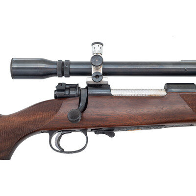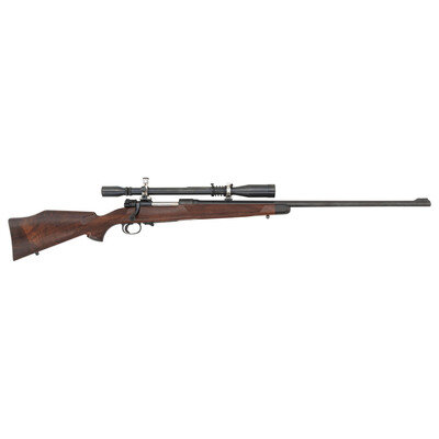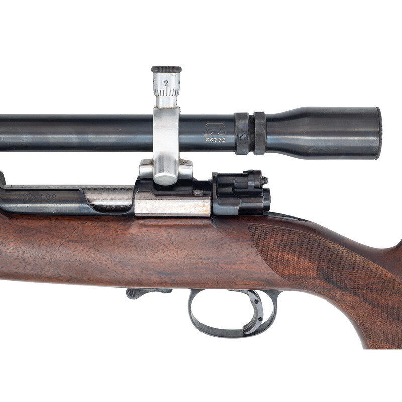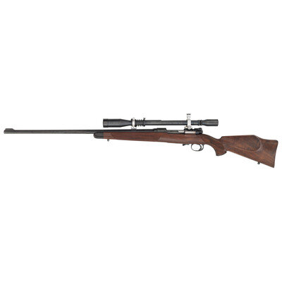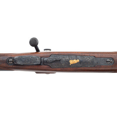 5.6x57. 28" barrel. SN: 4778. Blued finish, jeweled bolt, Monte Carlo style hardwood stock, horn forend and grip caps. Bolt action, highly embellished sporterized Mauser with a Bohler Spezial marked Austrian barrel, shoed trigger and a J Unertl 10x scope in adjustable mounts, with QD sling swivel studs. Magazine floor plate and triggerguard are profusely engraved with flowing foliate designs and further embellished with a raised gold leaf groundhog. The engraving is not signed by attributed to F.W. Ward. {MODERN}