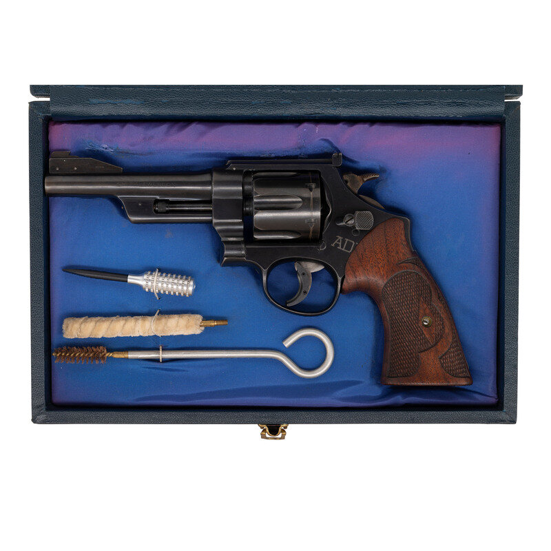 .38 Special. 5" barrel. SN: S67172. Blued finish, color casehardened hammer and trigger, checkered custom wood grips. Double action hand ejector revolver with 6-chambered swing out cylinder. Matching serial numbers on frame, rear of cylinder and in ejector rod channel. Grips are replacements. Frame and crane with matching mating number 5265. Revolver has been modified, barrel likely shortened by about 1.5" as the crown does not look like factory work. Equipped with a King marked serrated ramp front sight base with angled reflector for blade and a "KING PAT. PEND." marked semi-Patridge front sight blade. Rear sight is adjustable with a white out line square notch. A trigger shoe has been added to the grooved trigger. The initials ADK are stippled into the left side of the frame with the "K" hidden by the grip. The revolver is accompanied by a fitted S&W marked wood box with textured faux leather covering and blue satin lining, toning to purple. The cleaning implements remain in the box as well. The box appears to be for a 4" revolver and this one does not fit correctly. {MODERN}