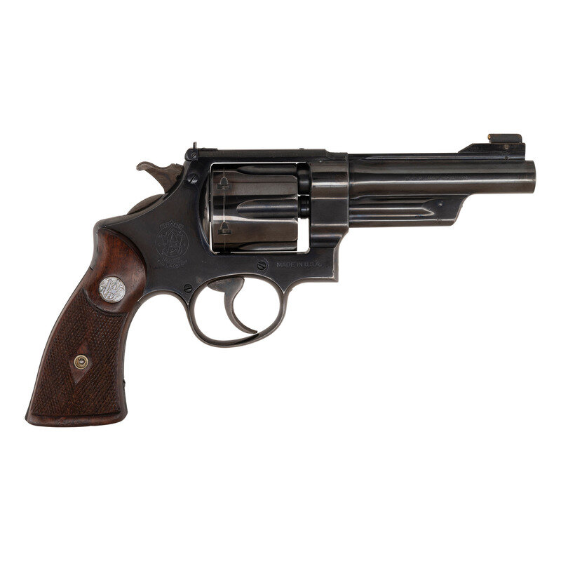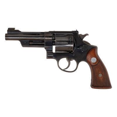 .357 Magnum. 4.5" ribbed barrel. SN: 61518. Blued finish, color casehardened hammer and trigger, checkered hard wood Smith & Wesson medallion grips. Double action 5 screw frame, pinned and recessed revolver with six-chamebered fluted cylinder. Modified by King's Gun Works, the barrel has been shortened, the top strap and barrel rib checkered and a King's ramped blade front sight with brass bead light reflector have been added. Matching serial numbers on frame, rear face of cylinder and inside the ejector rod cut out, with the matching mating number 44556 in the frame and on the crane. A nice example of a King's customized revolver that would make a great carry gun today. {MODERN}