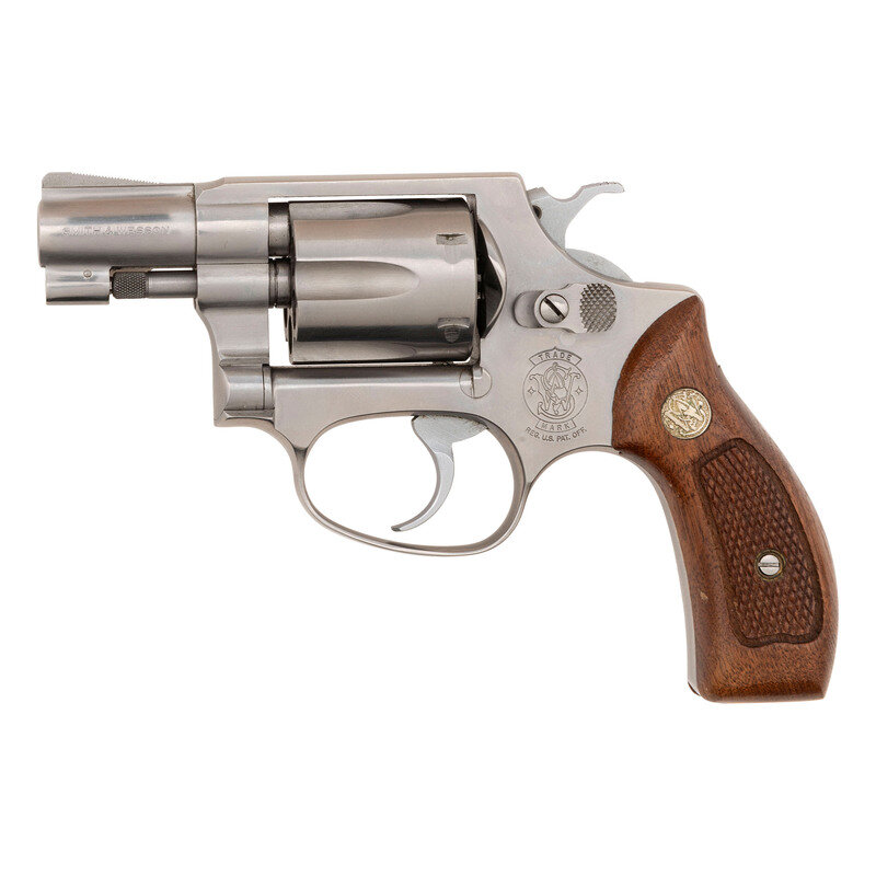 .32 H&R Magnum. 2" barrel. SN: BEY4948. Stainless steel finish, checkered hardwood grips with Smith & Wesson medallions. Double action hand ejector J-frame revolver with fluted six-chambered swing out cylinder, top strap groove rear sight and serrated ramp front sight. In factory cardboard box with a spare set of rubber Hogue Monogrips and factory paperwork.