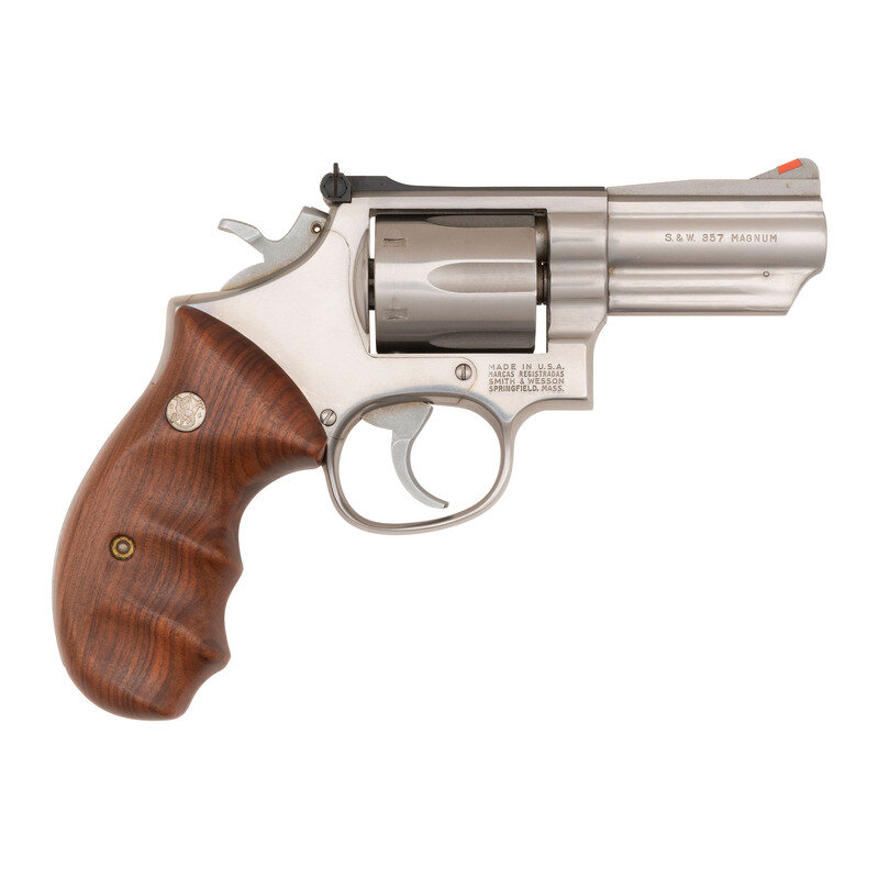 .357 Magnum. 3" barrel with full lug. SN: AHL8890. Stainless steel finish, finger grooved smooth hardwood Smith & Wesson medallion grips. Double action revolver with swing out hand ejector, six-chambered fluted cylinder. Equipped with black adjustable square notch rear sight and orange insert serrated ramped front sight. Includes original factory box.