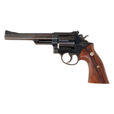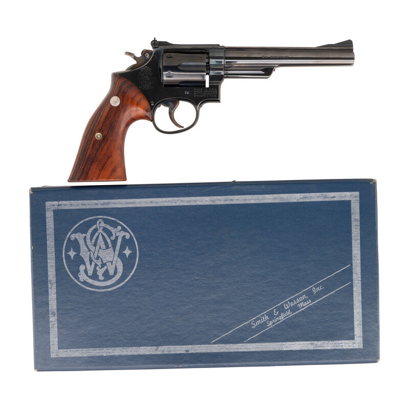 .22 Remington Jet, .22LR. SN: K475846. Blued metal finish with case colored hammer and trigger mounting smooth walnut Smith & Wesson medallion grips. Double action six-shot hand ejector revolver with full length matted barrel rib mounting adjustable rear notch and matted Baughman Quick Draw front blade sights. Item features a pinned barrel and recessed cylinder on a four screw frame. Markings include Smith & Wesson monogram trade mark to sideplate and four-line address to the right frame. Barrel flanks show standard maker and caliber marks. Comes in a matching blue cardboard box with Smith & Wesson markings, cardboard liner and paperwork. Item currently mounts the .22 Jet cylinder and comes with a full set of six-sleeves permitting this cylinder to fire .22 Long Rifle ammunition. {C&R}