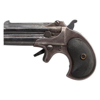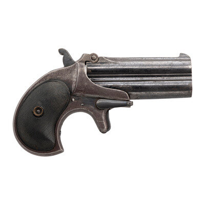 .41 RF. 3" barrels. SN: 867. Blued metal finish overall mounting checkered hardrubber grips and fixed front blade and hinge notch rear sights. Two-shot superposed barrel breechloading Derringer pistol with pivoting locking key to right frame. Single line address to barrel rib reads REMINGTON ARMS CO. ILION, N.Y. Hand operated ejector is knurled.