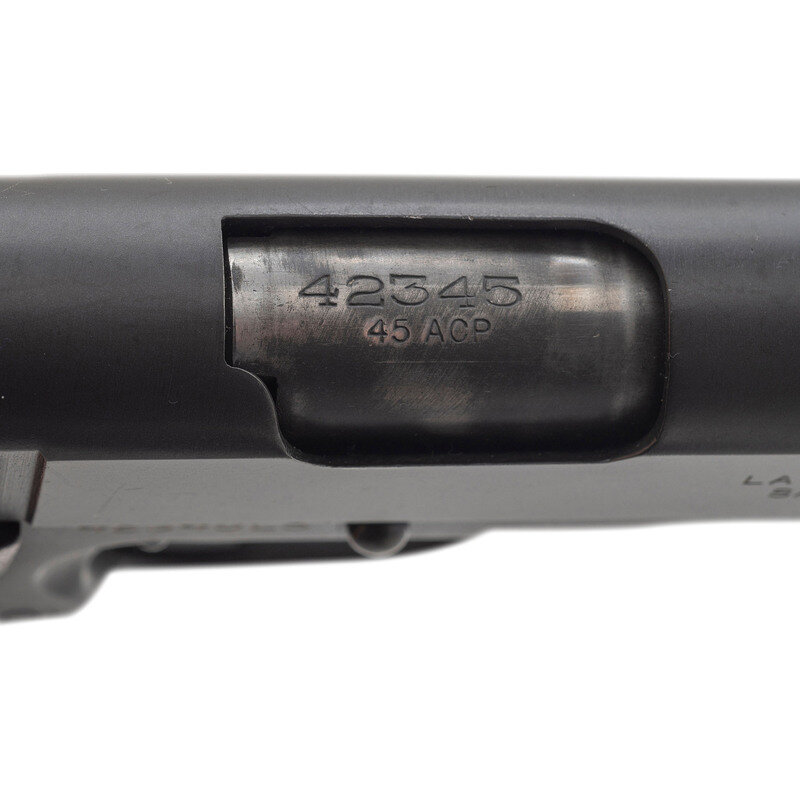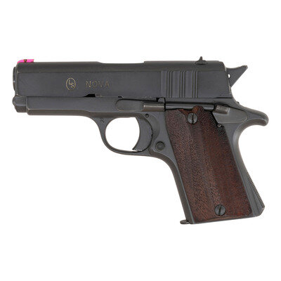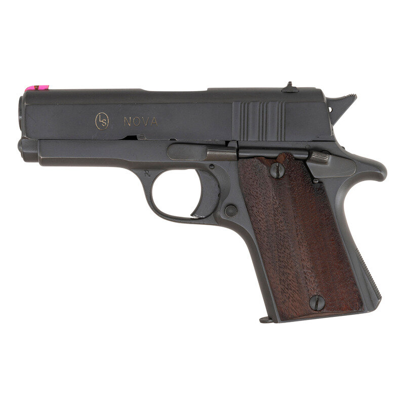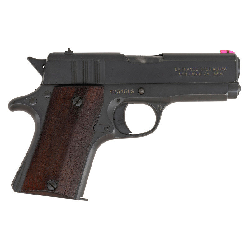 .45 ACP. 3.625" barrel length. SN: 42345LS. Parkerized metal refinish overall mounting smooth walnut grips and low-profile two-dot rear notch and orange synthetic front blade sights. Short-recoil operated single action autoloading pistol fed by detachable box magazines. Item features an LS logo marked frame with further La France marks consisting of LA FRANCE SPECIALTIES/SAN DIEGO, CA. U.S.A. to the right slide and LS NOVA to the left. Standard features include a full length guide rod, bushingless bull barrel, pyramid shaped hammer, and horizontal checkering to the base of the rear gripstrap. Serial number matches on the barrel and frame. Item features a pivoting trigger, indicating it follows the pattern of Spanish Star pistols used as parent guns for La France Specialties Nova pistols. {Modern}
