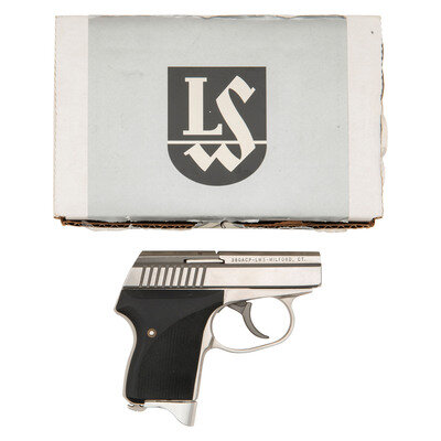 .380 ACP. 2.06" barrel length. SN: LS3749. Polished stainless steel finish overall mounting checkered black synthetic grips with no iron sights. Simple blowback operated DAO autoloading pistol in the original box with owner's manual. Item shows standard make and model markings. {MODERN}