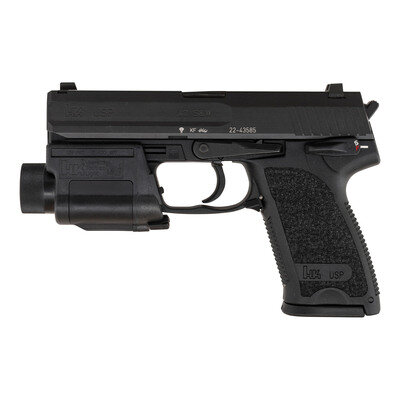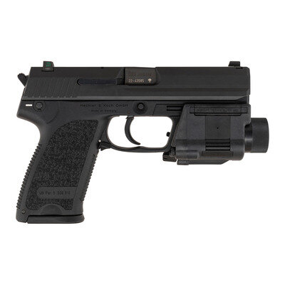 .40 S&W. 4.25" barrel length. SN: 22-43585. Black oxide metal finish in black synthetic frame featuring Heckler & Koch pattern accessory rail. Short recoil operated DA/SA autoloading pistol fed by detachable double stack magazines and mounting fixed triple TRU DOT sights. Standard make and model markings overall, including German proofs to major parts, and right frame marked Heckler & Koch GmbH/Made in Germany. Comes with a weapon light marked HK Universal/Tactical/Light MkII. {MODERN}