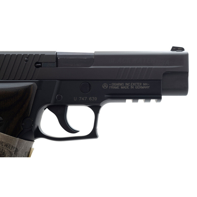 9mm. 4.4" barrel. SN: U747639. Blackened slide, blued barrel, blackened aluminum frame, both custom Blackwater and plastic grips. Double action semi-automatic tilting barrel pistol with removable magazine, de-cocker, Picatinny accessory rail and three dot fixed Siglite night sights. With original box, paperwork, gun lock, fired casing and a total of five 15-round {MODERN}