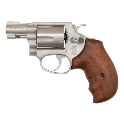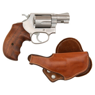 .38 Special. 1.875" barrel length. SN: R173471. Brushed stainless steel finish overall mounting matte hammer and trigger, and fixed rear notch and matted front ramp sights. Double action five shot hand ejector revolver mounting smooth walnut oversize custom grips. Item features a pinned barrel on a three screw frame. Standard make and model markings including four line address to right frame and monogram trade mark to the left. Comes in a leather outside waistband holster with no visible maker markings. {MODERN}