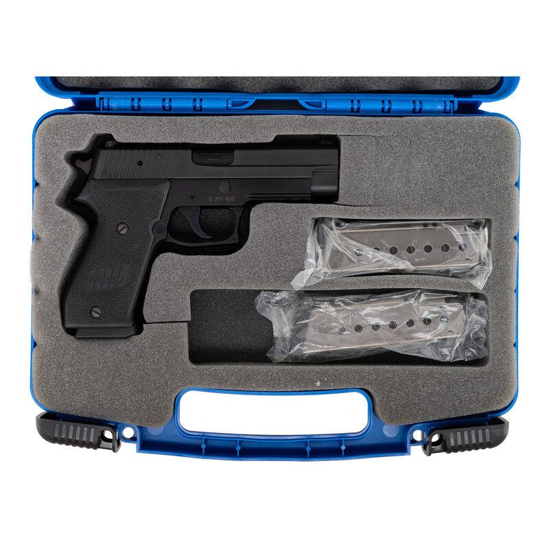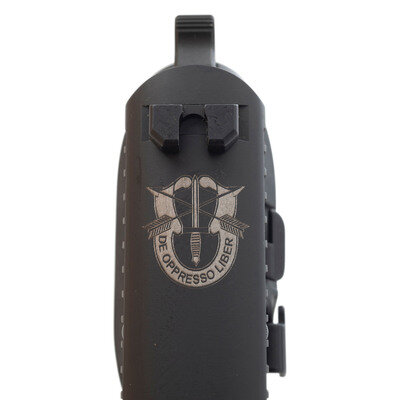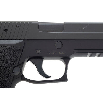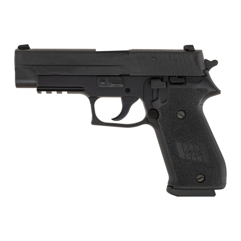 .45ACP. 4.4" barrel. SN: G371933. Blackened slide, blued barrel, blackened aluminum frame, plastic grips. Double action semi-automatic tilting barrel pistol with removable magazine, de-cocker, Picatinny accessory rail and three dot fixed Siglite night sights. Top of slide laser engraved with the 5th Special Forces Group logo. Pistol is "as new" in box with accessories including factory paperwork, gun lock and a total of 3 magazines. Note that this is not in the special "5SFG" serial number range made in very limited numbers specifically for members of that group, but the model listed on the box does note "220R-45-SF" indicating the "Special Forces" designation. {MODERN}